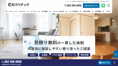 福岡県福岡市・糟屋郡において事業を展開する株式会社クリテックは、お客様のご要望の優先順位やご予算を最重要視した戦略的なリフォーム計画の立案を得意としています。住まいの不便さや古くなった設備の使いにくさという多面的な課題に対し、各種工事内容を体系的に分類・整理することで、効率的で効果的な改修ソリューションを提供しています。希望に合わせた施工内容と柔軟な対応により、お客様固有の生活環境に最適化されたカスタムリフォームを実現しています。 小さな修繕から大規模なリフォームまでの幅広い対応力を活かし、水回りから外壁まで多様なメニューを統合的に提供しています。設備の更新から建具の調整まで包括的に扱い、仕様変更にも迅速かつ柔軟に対応することで、糟屋郡エリアにおいて暮らしに適合しない要素を根本的に改善する提案を展開しています。地域密着型のサービス展開により、お客様との継続的なパートナーシップを構築し、長期的な住まいの価値向上を支援しています。